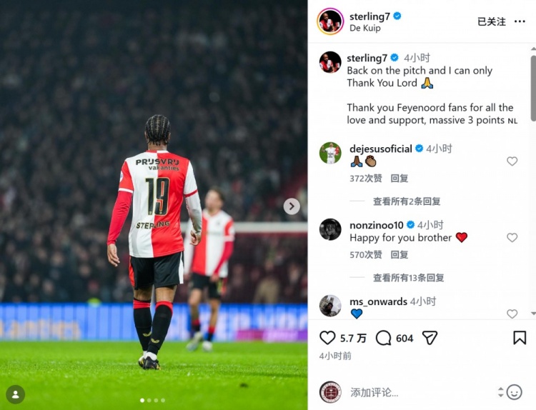 斯特林此役替补出场,上演费耶诺德首秀,赛后他在社交媒体上写道:“重返赛场,对上帝唯有感恩。”