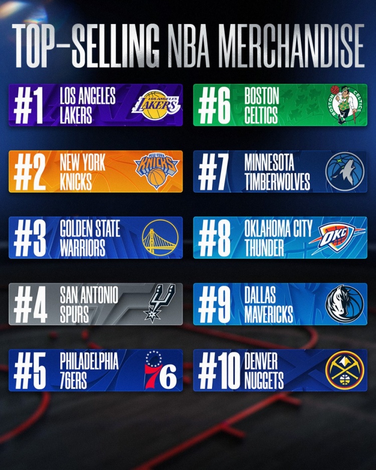 1月21日讯 NBA官方公布了25-26赛季上半赛季球队球衣销量排行,该数据均基于NBAStore的销售数据。详细排名如下:1、湖人2、尼克斯3、勇士4、马刺5、76人6、凯尔特人7、森林狼8、雷霆9、独行侠10、掘金...